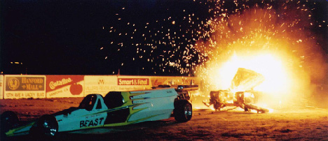 In this photo, a car chained to the back of the Beast is being cooked by the Beast's afterburner. Needless to say, not much was left of the car afterwards.