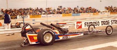 From 1975-1985, Jeff Atamian owned and raced the Iron Horse front engine dragster. This early version of the Iron Horse was equipped with a 156" W.B. carburated 468 cubic inch Big Block Chevy with Powerglide transmission. It ran 8.40 seconds at 160 mph in the quarter mile.